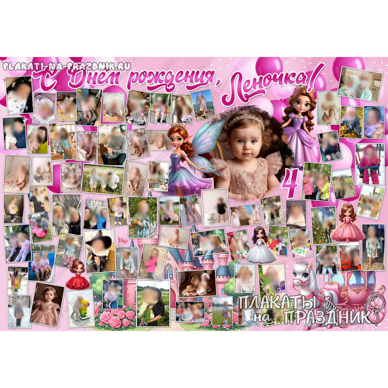 Четыре года — это особенный возраст, когда мир кажется настоящей сказкой, а каждая девочка чувствует себя маленькой принцессой. Плакат ко дню рождения станет волшебным проводником в этот удивительный мир, где реальность переплетается с мечтами. Нежный розовый фон, словно облако из сахарной ваты, создаёт атмосферу безмятежного счастья, а яркий заголовок притягивает взгляд и задаёт праздничное настроение.